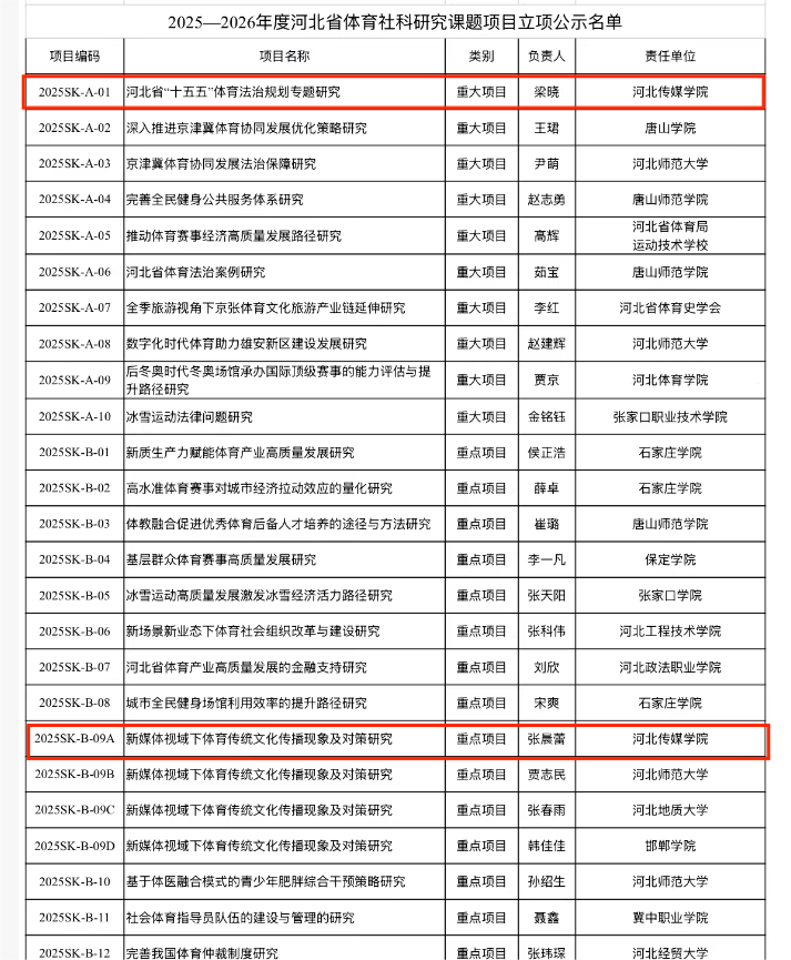 近日,河北省体育局正式公布 2025—2026 年度河北省体育社科研究课题立项名单。其中,我校马克思主义学院梁晓院长牵头的《河北省 “十五五” 体育法治规划专题研究》成功获批重大课题立项,文化产业管理学院张晨蕾老师申报的《新媒体视域下体育传统文化传播现象及对策研究》获批重点课题立项。这是我校在体育领域科研立项上的重大突破。此次重大课题与重点课题的成功立项,是相关学院领导和教师艰苦努力的结果,也同学校长期以来对科研工作的高度重视密不可分。今后,我校将继续以高质量科研立项和科研成果为河北省体育事业发展及体育强省建设提供有力的学术支持和决策参考。