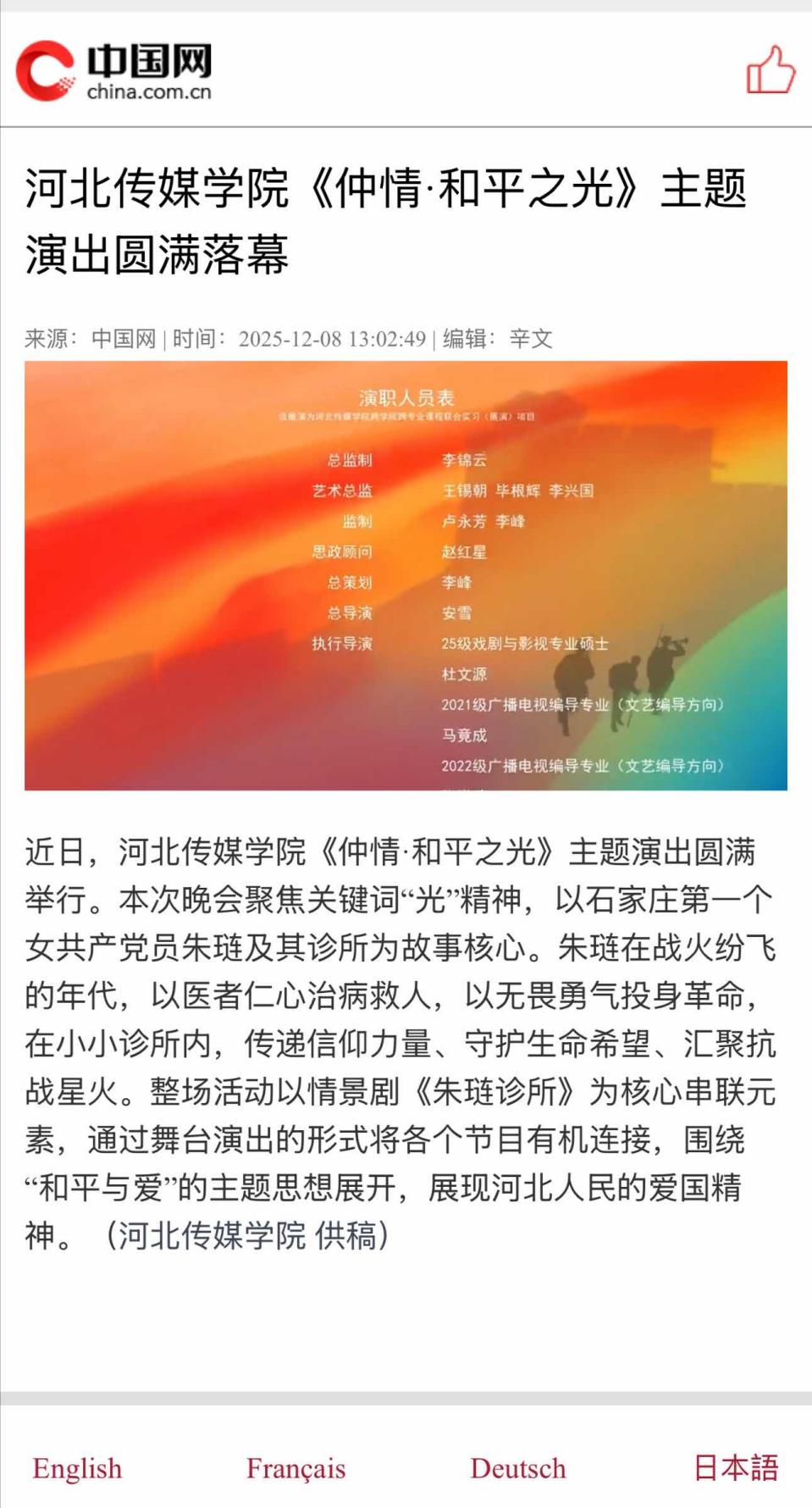 刘丽萍为活动致辞,她表示,今年河北创拍电影《闪耀少年之空中接力》获第38届中国金鸡奖最佳儿童片,联合出品的《志愿军:存亡之战》斩获三项大奖,本土电影《寻砖》摘得中美电影节“中华文化国际传播力”奖,联合出品的《山河为证》揽获国内外纪录电影大奖,电影《月光里的男孩》提名第38届中国电影金鸡奖最佳导演处女作、最佳儿童片,这些荣誉对河北的电影工作者是鼓励也是鞭策。评选与推介不是目的,更重要的使命是搭建高效平台,让优质影视内容突破地域界限,以创新思维开拓市场空间,共同推动河北影视创作从“高原”迈向“高峰”。